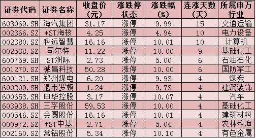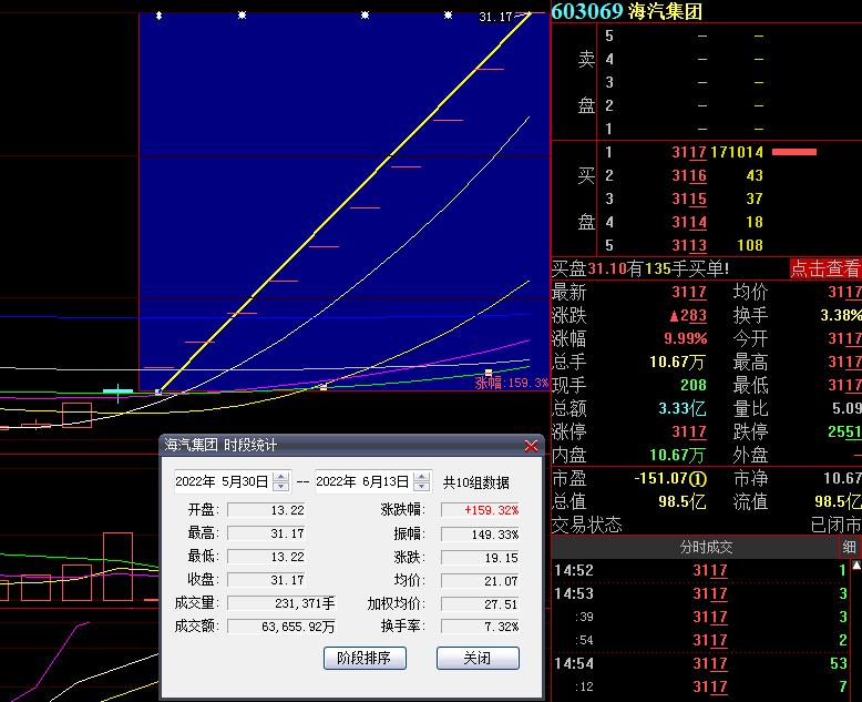 6月13日,熱門股海汽集團再度漲停,截至收盤,報31.17元,總市值達98.5億元,走出了10連板,期間累計漲達159.32%。