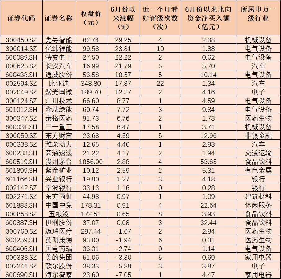表:6月份以來北向資金加倉的前十大活躍股一覽