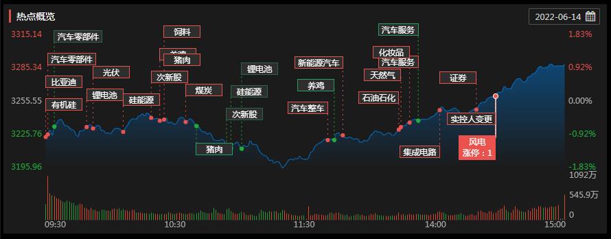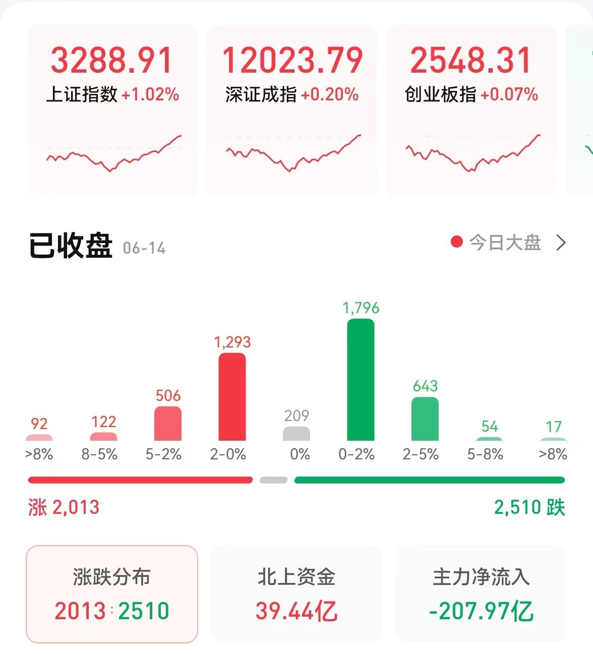 6月14日,三大股指低開(kāi)高走,全線飄紅,截至收盤,上證指數(shù)漲1.02%報(bào)3288.91點(diǎn),深證成指漲0.2%報(bào)12023.79點(diǎn),創(chuàng)業(yè)板指漲0.07%報(bào)2548.31點(diǎn);兩市合計(jì)成交10994億元,連續(xù)第3個(gè)交易日突破萬(wàn)億元;北向資金凈買入39.44億元。總體來(lái)看,兩市個(gè)股跌多漲少。