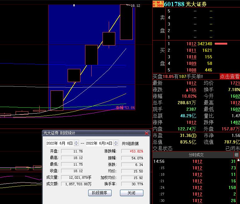 6月14日,券商板塊漲幅居首達(dá)5.39%。光大證券、財(cái)達(dá)證券、永安期貨、中信建投、紅塔證券、長(zhǎng)城證券等6只個(gè)股集體漲停。值得注意的是,光大證券近日表現(xiàn)強(qiáng)勢(shì),近5個(gè)交易日中,斬獲4個(gè)漲停板,期間累計(jì)漲幅達(dá)53.82%。