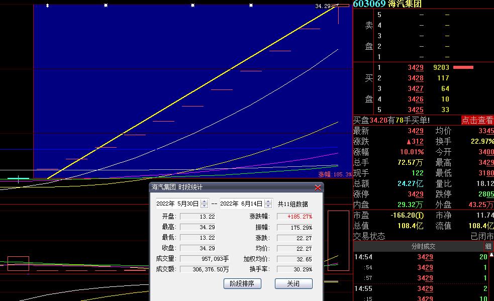 6月14日,熱門股海汽集團(tuán)再度漲停,截至收盤,報(bào)34.29元,總市值達(dá)108.4億元,走出了11連板,期間累計(jì)漲達(dá)185.27%。