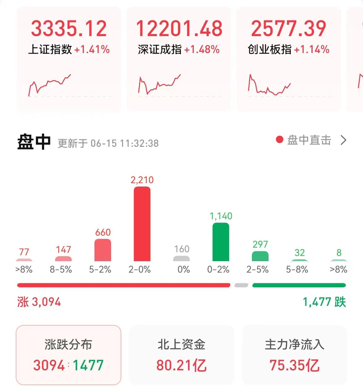 6月15日,三大股指震蕩攀升,全線飄紅。截至上午收盤,上證指數漲幅達1.41%,報3335.12點;深證成指和創業板指漲幅分別為1.48%和1.14%;滬深兩市合計成交額7772.5億元;總體來看,兩市個股漲多跌少。