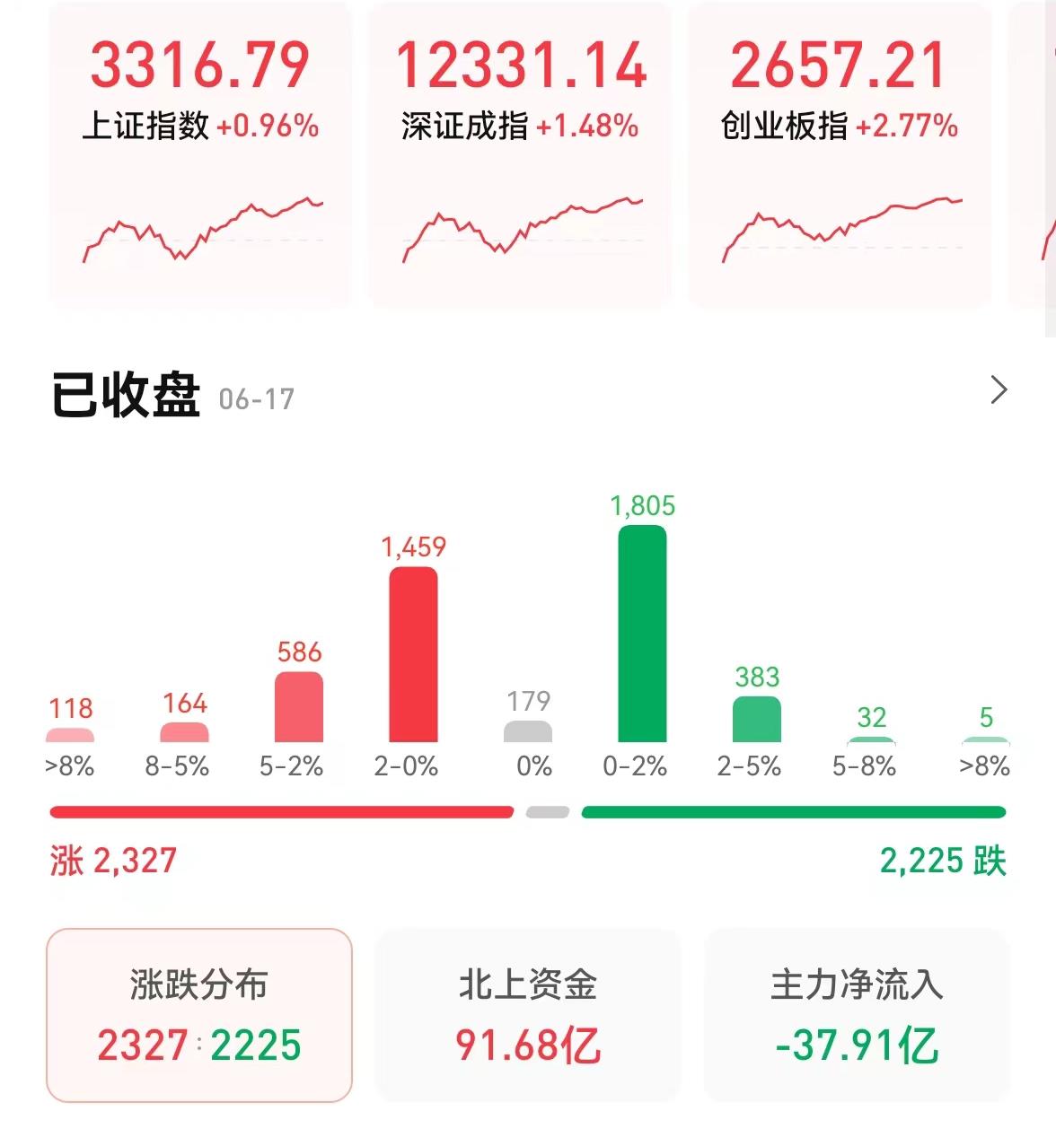 6月17日,三大股指低開高走,集體收漲,截至收盤,上證指數漲0.96%報3316.79點,深證成指漲1.48%報12331.14點,創業板指漲2.77%報2657.21點;兩市合計成交10934億元,連續第6個交易日突破萬億元;北向資金凈買入91.68億元。總體來看,A股個股漲多跌少。其中,有76只個股漲停。