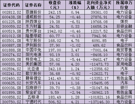 值得關注的是,北向資金今日呈凈流出態勢,全天凈賣出97.03億元。其中,恩捷股份、通威股份等2只個股,凈買入金額均超2億元。另外,寧德時代、五糧液等凈賣出金額均超10億元。