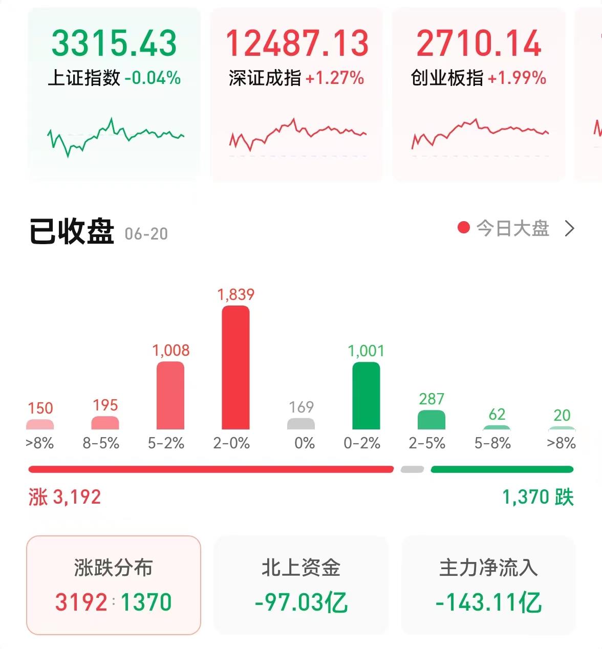 6月20日,三大股指震蕩分化,截至收盤,上證指數微跌0.04%報3315.43點,深證成指漲1.27%報12487.13點,創業板指漲1.99%報2710.14點;兩市合計成交額達11644.6億元,已連續七個交易日突破萬億元,北向資金凈賣出97.03億元??傮w來看,兩市個股漲多跌少,有108只個股漲停。