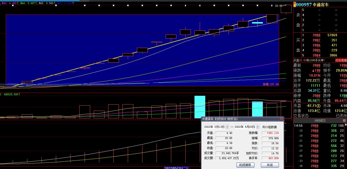 6月20日,熱門汽車股中通客車再度漲停,截至收盤,報20.88元,總市值達123.8億元。該股自5月13日啟動以來,21個交易日累計漲幅達381.11%。