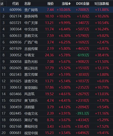 6月21日,傳媒行業漲幅居首,達1.09%。其中,貴廣網絡、游族網絡和中廣天擇等3只個股集體漲停。