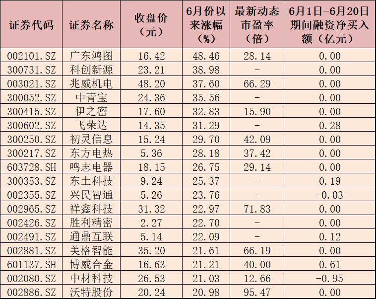 表:6月份以來漲幅超20%的5G概念股一覽