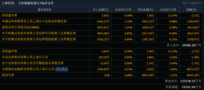 盤后龍虎榜數據顯示,深股通賣出7.36億元并買入3.64億元,中信證券上海分公司賣出1.8億元,一機構專用席位凈賣出8434萬元。