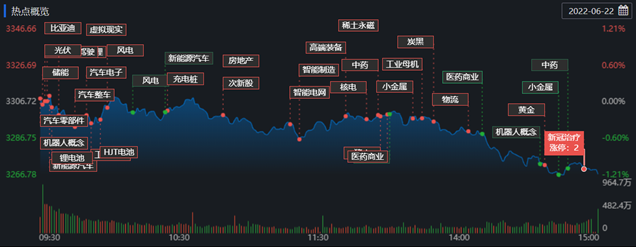 6月22日,A股三大股指回落,截至收盤,上證指數跌1.20%報3267.20點,深證成指跌1.43%報12246.55點,創業板指跌0.58%報2677.29點;兩市合計成交額達9964.54億元,北向資金凈賣出68.20億元。總體來看,兩市個股漲少跌多,上漲個股有948只。