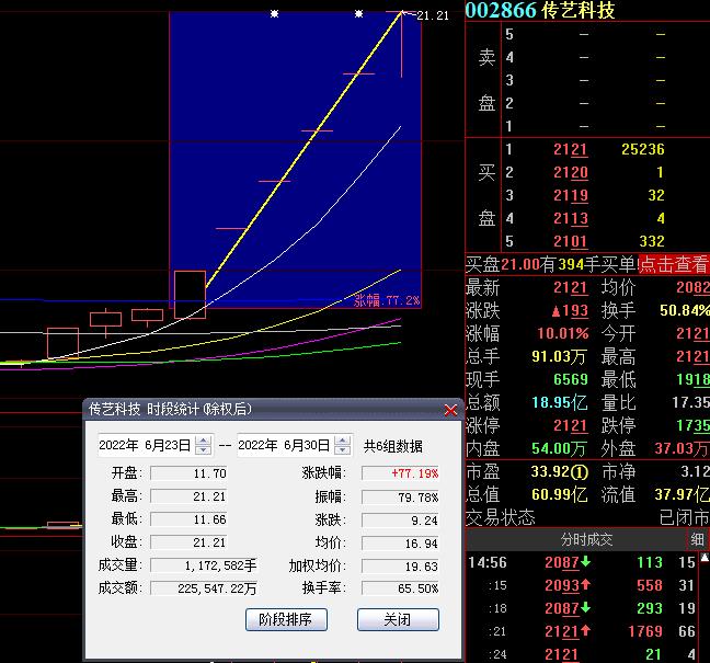 6月30日,熱門股傳藝科技再度漲停,截至收盤,報21.21元,連續(xù)6個交易日漲停,期間累計漲達77.19%。
