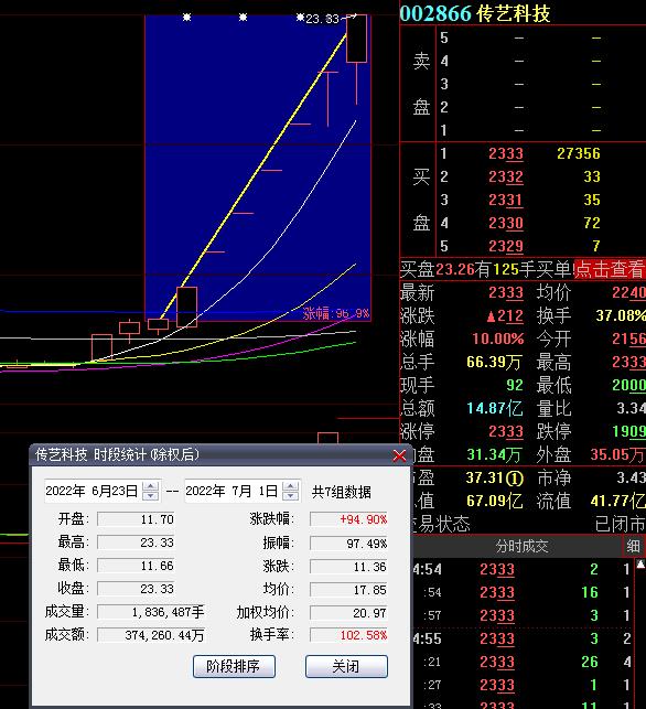 7月1日,熱門股傳藝科技再度漲停,截至收盤,報23.33元,連續7個交易日漲停,期間累計漲達94.9%。