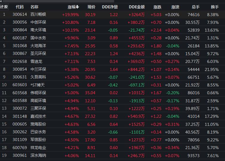 7月1日,環保行業漲幅居前達2%。其中,百川暢銀、國中水務、*ST博天等3只概念股集體漲停。