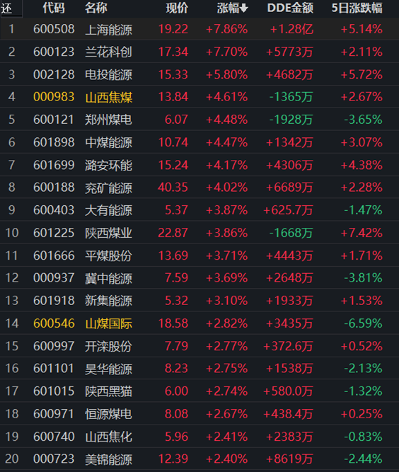 從領漲的煤炭開采加工行業看,截至7月5日11:30,行業交易中的33只個股,有31只上漲,其中,上海能源、蘭花科創和電投能源漲幅超5%。從資金流向看,煤炭開采加工上午大單資金凈流入額達6.09億元,居各行業第1位。