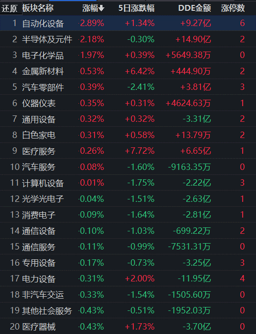 從領漲的自動化設備行業看,截至7月6日11:30,行業交易中的78只個股,有57只上漲,有19只個股漲幅超5%,有6只個股漲停。從資金流向看,自動化設備行業上午大單資金凈流入額達9.27億元,居各行業第2位。