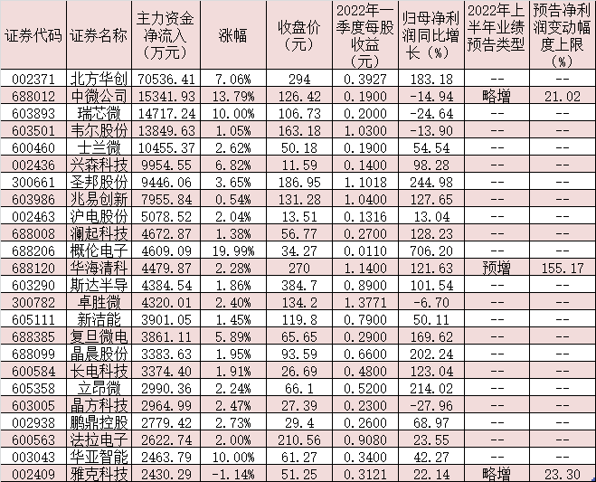 表:7月6日主力資金凈流入超2000萬元的半導體概念股