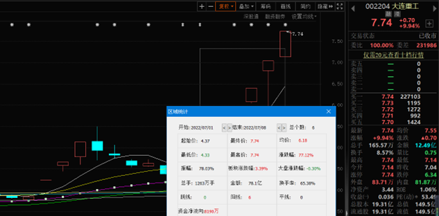 7月8日,大連重工再度漲停,報7.74元,自7月1日以來,截至7月8日已連續6個交易日以漲停板報收,累計漲幅達77.12%。