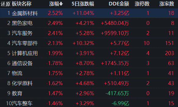 同花順行業方面,截至7月19日11:30,76類行業中有50類上漲,占比65.79%。金屬新材料行業居漲幅榜首,漲幅達2.52%,此外,包括黑色家電和汽車服務等在內的3類行業漲幅也均超2%;下跌超1%的行業分別為養殖業和電力,分別下跌1.11%和1.07%。
