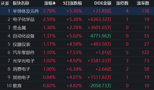 從漲幅居首的半導體及元件行業看,截至7月21日11:30,行業交易中的151只個股,有138只上漲,其中,有4只個股漲停,有31只個股漲幅超5%。從資金流向看,半導體及元件行業今天上午大單資金凈流入額達21.85億元,居各行業第1位。