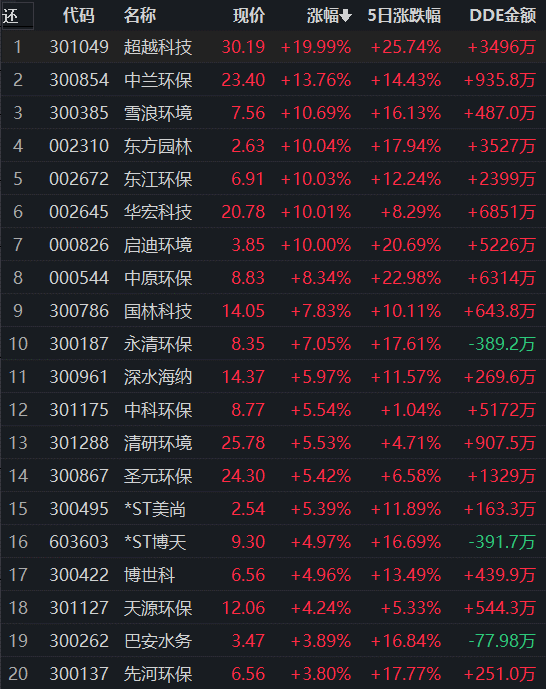 從漲幅居首的環保行業看,截至7月22日11:30,行業交易中的131只個股,有109只上漲,其中,有6只個股漲停,有15只個股漲幅超5%。從資金流向看,環保行業今天上午大單資金凈流入額達3.70億元,居各行業第2位。