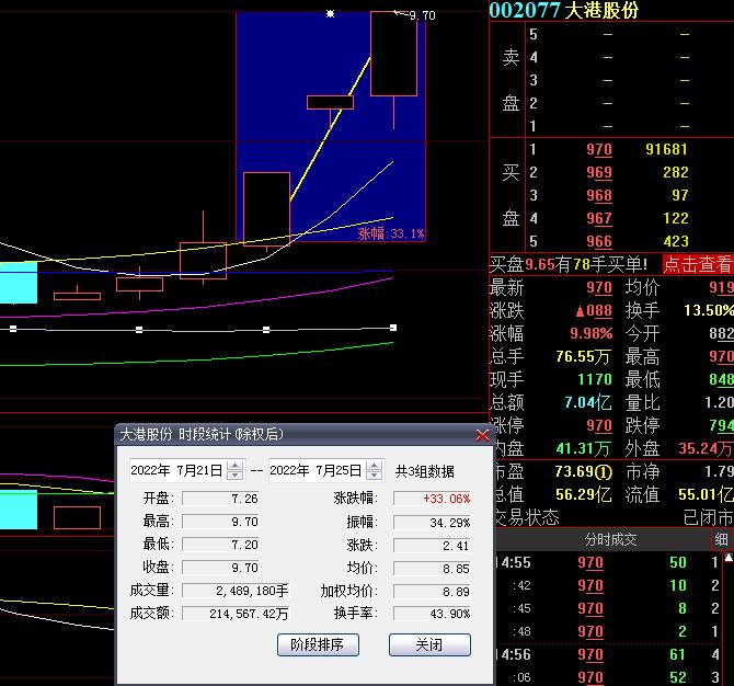 7月25日,大港股份再度漲停,截至收盤,報9.70元,連續3個交易日漲停,期間累計漲達33.06%。