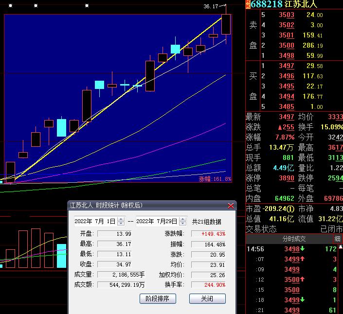 7月29日,熱門股江蘇北人漲幅達(dá)7.87%,截至收盤,報(bào)34.97元,月內(nèi)期間累計(jì)漲達(dá)149.43%,位居7月份滬深兩市個(gè)股漲幅榜首位。