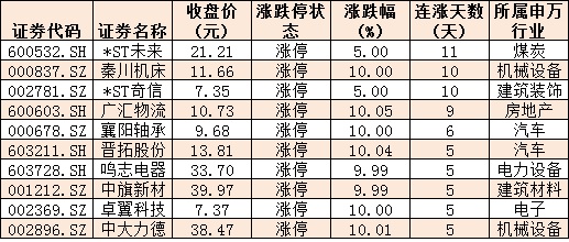 表:今日漲停且連漲5日以上的個(gè)股情況: