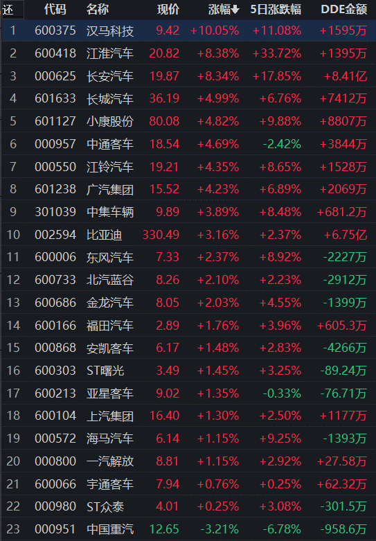 從漲幅居首的汽車整車行業(yè)看,截至8月1日11:30,行業(yè)交易中的23只個(gè)股,有22只上漲,其中,有1只個(gè)股漲停,有8只個(gè)股漲幅超4%。從資金流向看,汽車整車行業(yè)今天上午大單資金凈流入額達(dá)16.63億元,居各行業(yè)第1位。