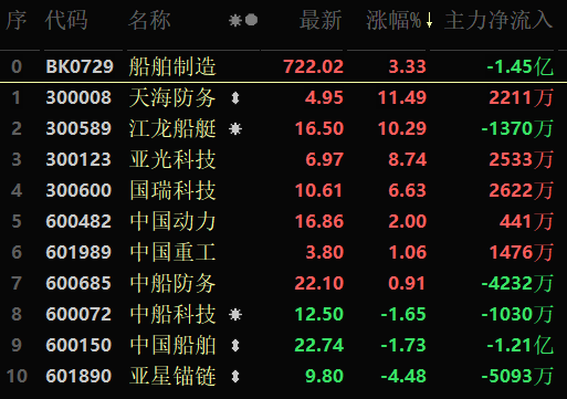 從漲幅居首的船舶制造行業看,截至8月2日11:30,行業交易中的10只個股,有7只上漲,其中,有4只個股漲幅超6%。從資金流向看,船舶制造行業今天上午大單資金凈流入額達-1.45億元。