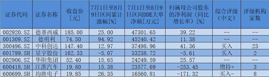 表:7月1日至8月9日,無人駕駛概念板塊期間累計獲大單資金凈流入額超億元個股一覽