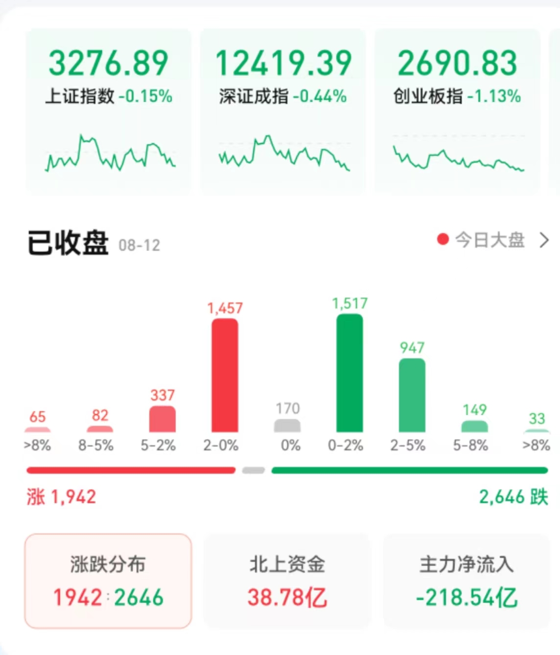 8月12日,三大股指集體收跌,截至收盤,上證指數(shù)跌幅達0.15%報3276.89點,深證成指跌幅達0.44%報12419.39點,創(chuàng)業(yè)板指跌幅達1.13%報2690.83點;兩市合計成交額9995億元,北向資金凈買入38.78億元。總體來看,A股個股跌多漲少。