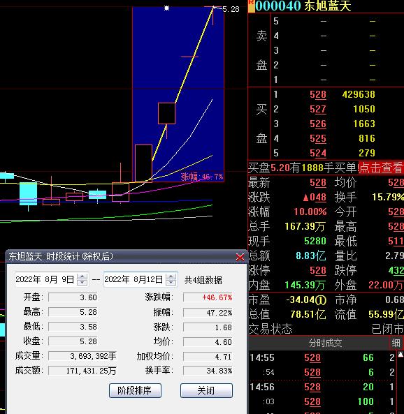8月12日,熱門股東旭藍天再度漲停,截至收盤,報5.28元,實現(xiàn)4連板累計漲幅達46.67%。