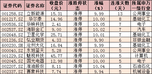 表:今日漲停且連漲5日以上的個股情況: