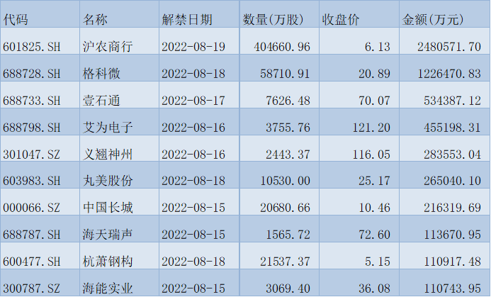 從解禁看,下周將有46只股票面臨限售股解禁,合計解禁量為58.61億股;按最新收盤價計算,合計解禁市值為652.41億元。