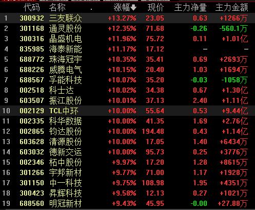 8月15日,申萬一級行業(yè)中電力設(shè)備強(qiáng)勢上漲,漲幅達(dá)3.35%,主力資金凈流入達(dá)64.44億元。行業(yè)311只交易中的個股,有274只上漲,其中,包括川潤股份、科士達(dá)、振江股份、TCL中環(huán)、科華數(shù)據(jù)、清源股份等在內(nèi)的10只個股集體漲停。