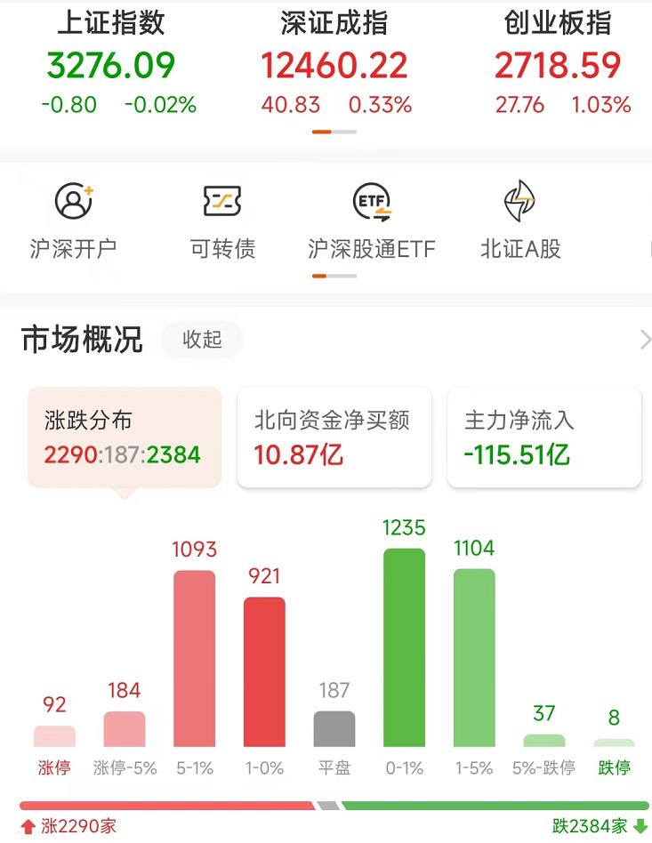 今日三大指數(shù)走勢分化,上證指數(shù)維持弱勢盤整,創(chuàng)業(yè)板指漲超1%。截至收盤,上證指數(shù)跌0.02%報(bào)3276.09點(diǎn),深證成指漲0.33%報(bào)12460.22點(diǎn),創(chuàng)業(yè)板指漲1.03%報(bào)2718.59點(diǎn);兩市合計(jì)成交額達(dá)9764億元,北向資金凈買入10.87億元??傮w來看,個股跌多漲少,4856只交易中的個股,有2290只上漲。