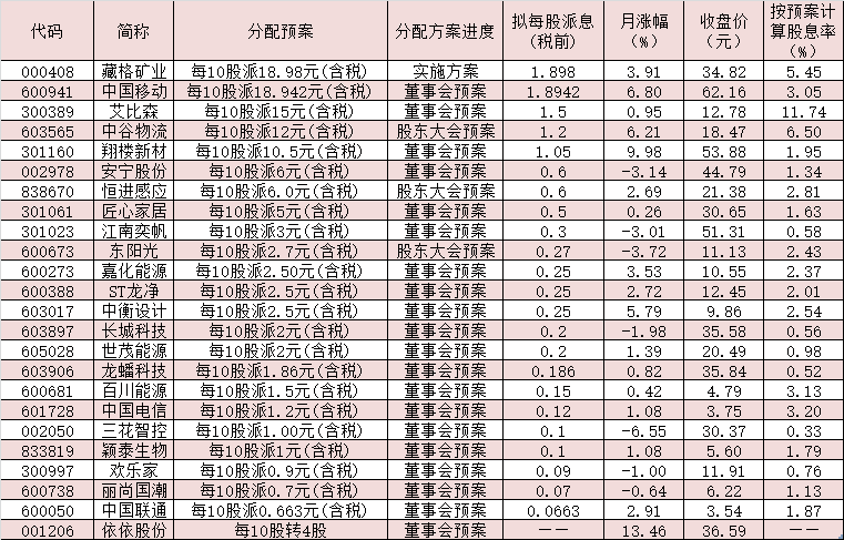 從單家公司來看,上述23家公司中,有8家公司擬每股派現金額均在0.5元及以上,藏格礦業擬每股派現金額居首,達到1.898元,中國移動緊隨其后,擬每股派現金額也達1.8942元,艾比森、中谷物流、翔樓新材擬每股派現金額分別達到1.5元、1.2元、1.05元。