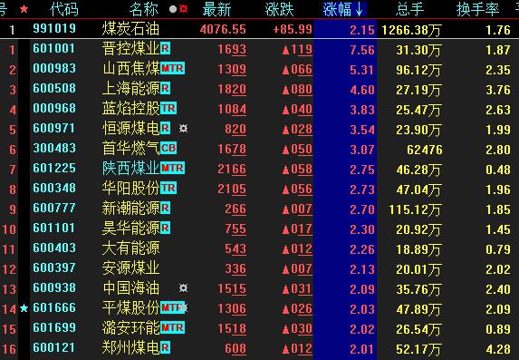 具體看,截至上午收盤,煤炭石油板塊走強,漲幅居首,達2.15%。其中,晉控煤業(yè)、山西焦煤、上海能源等個股漲幅居前均超4%。