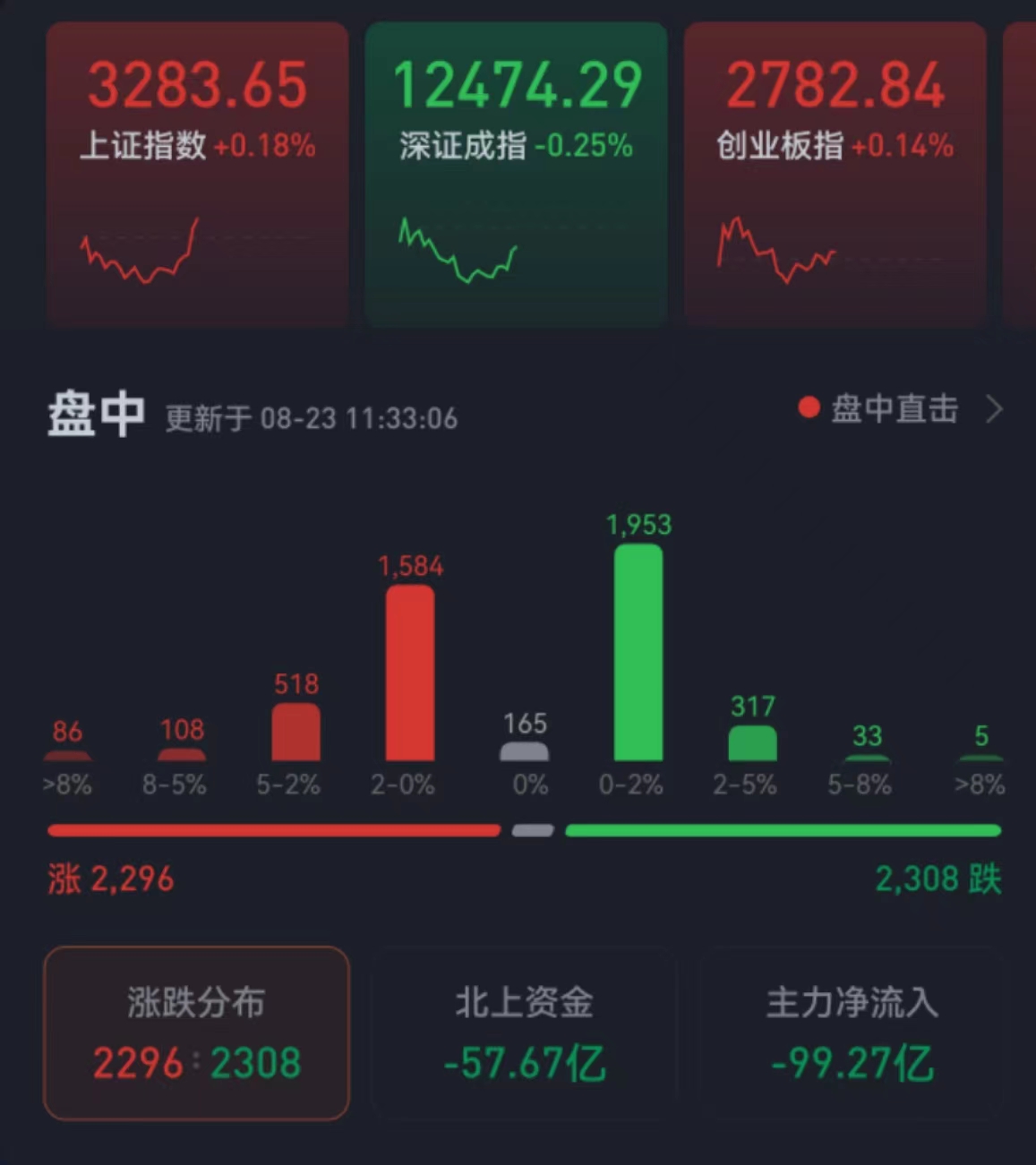 周二(8月23日),三大股指震蕩分化,漲跌不一。截至上午收盤,上證指數漲幅達0.18%,報3283.65點;深證成指跌幅為0.25%,創業板指漲幅為0.14%;滬深兩市合計成交額6295.3億元。