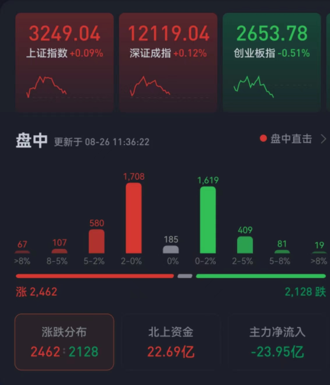周五(8月26日),三大股指震蕩分化,漲跌不一。截至上午收盤,上證指數(shù)漲幅為0.09%,報(bào)3249.04點(diǎn);深證成指漲幅為0.12%,創(chuàng)業(yè)板指微跌0.51%;滬深兩市合計(jì)成交額5889.2億元,總體來看,兩市個(gè)股漲多跌少。