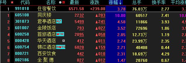 具體看,截至8月26日上午收盤,住宿餐飲板塊走強(qiáng),漲幅居首,達(dá)3.78%。其中,同慶樓報(bào)收于漲停,君亭酒店、金陵飯店、華天酒店、首旅酒店、錦江酒店等個(gè)股漲幅均超2%。