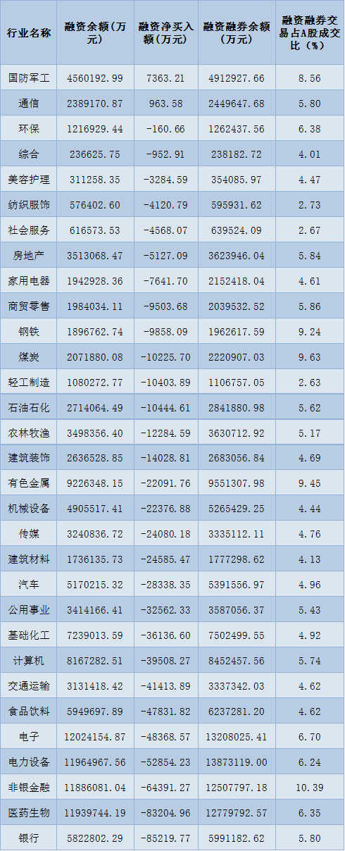 表:9月9日申萬一級行業(yè)兩融交易情況: