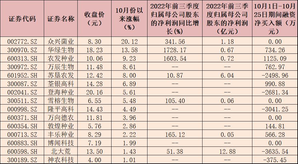 在秋糧收獲的季節,種植業也獲得市場的關注。10月份以來,截至10月26日,申萬二級種植業指數期間累計上漲4.07%,跑贏同期上證指數(期間累計下跌0.82%),其中,眾興菌業、華綠生物、農發種業、萬辰生物、蘇墾農發等個股期間累計漲幅居前五,漲幅均在8%及以上。