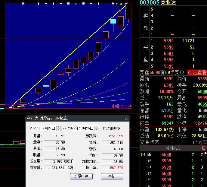 10月26日,熱門股競業達再度漲停,截至收盤,報55.99元,連續17個交易日上漲,累計漲幅達251.92%。