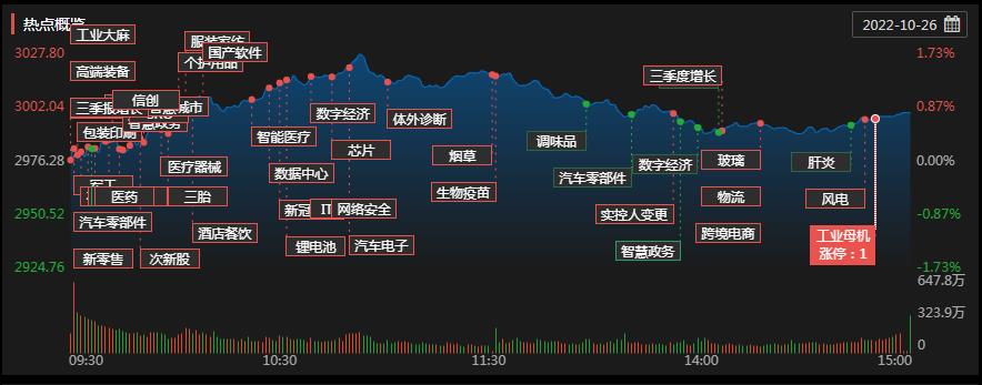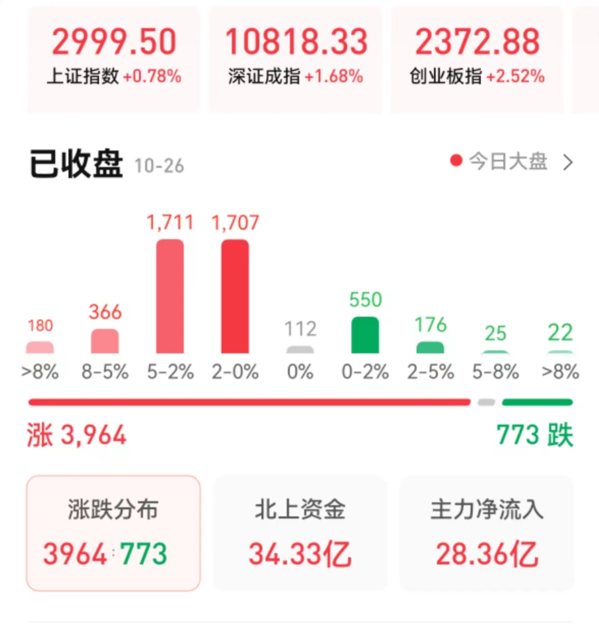 周三(10月26日),A股三大指數集體收漲。截至收盤,上證指數上漲0.78%報2999.5點,深證成指漲1.68%報10818.33點,創業板指漲2.52%報2372.88點;兩市合計成交9142億元,北向資金凈買入34.33億元。總體來看,A股個股漲多跌少,上漲個股為3964只,下跌個股773只。