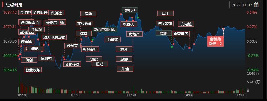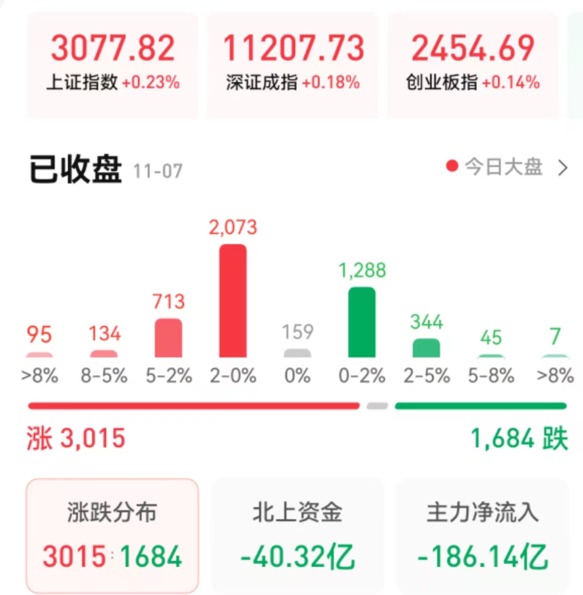 周一(11月7日),A股三大指數集體收漲,均走出六連陽的態勢。截至收盤,上證指數漲0.23%報3077.82點,深證成指漲0.18%報11207.73點,創業板指漲0.14%報2454.69點;兩市合計成交10061億元,連續第2個交易日突破萬億元;北向資金凈賣出40.32億元;總體來看,A股個股漲多跌少,