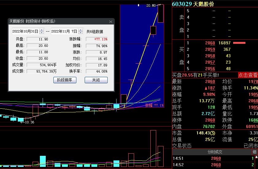 11月7日,熱門股天鵝股份再度漲停,截至收盤,報20.60元,連續6個交易日漲停,累計漲幅達77.13%。