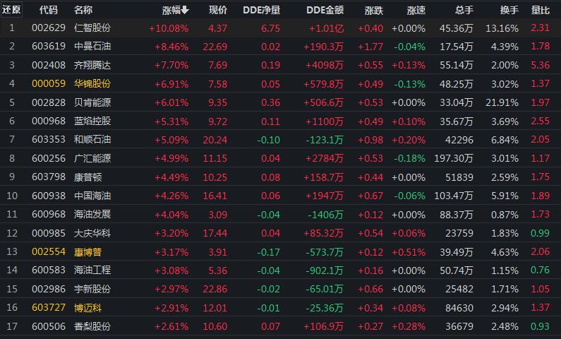 11月7日,石油石化行業漲幅居首,達2.38%。其中,仁智股份漲停。