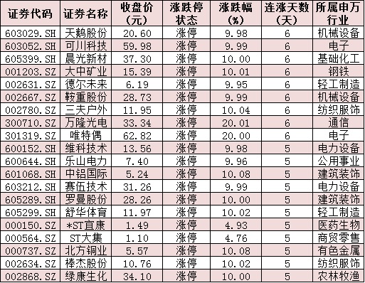 漲停板方面,11月7日,有79只個股漲停,沒有跌停個股。其中,有20只漲停股,股價已連續上漲5個交易日以上。從行業方面看,傳媒(7只)、醫藥生物(7只)、電子(6只)、紡織服裝(6只)、計算機(6只)等行業漲停股居前,均在6只及以上。
