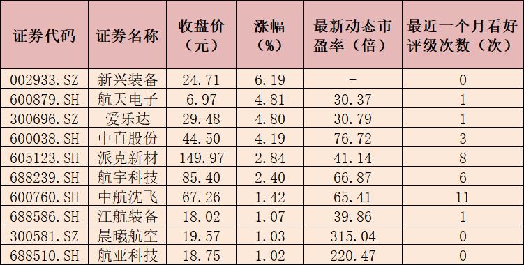 最近一個(gè)月內(nèi),有機(jī)構(gòu)對(duì)于航空航天概念股表示看好,具體來(lái)看,有34只個(gè)股獲機(jī)構(gòu)給予“買入”或“增持”等看好評(píng)級(jí),其中,光威復(fù)材、西部超導(dǎo)、中航高科獲得看好評(píng)級(jí)次數(shù)最多,均為15次。